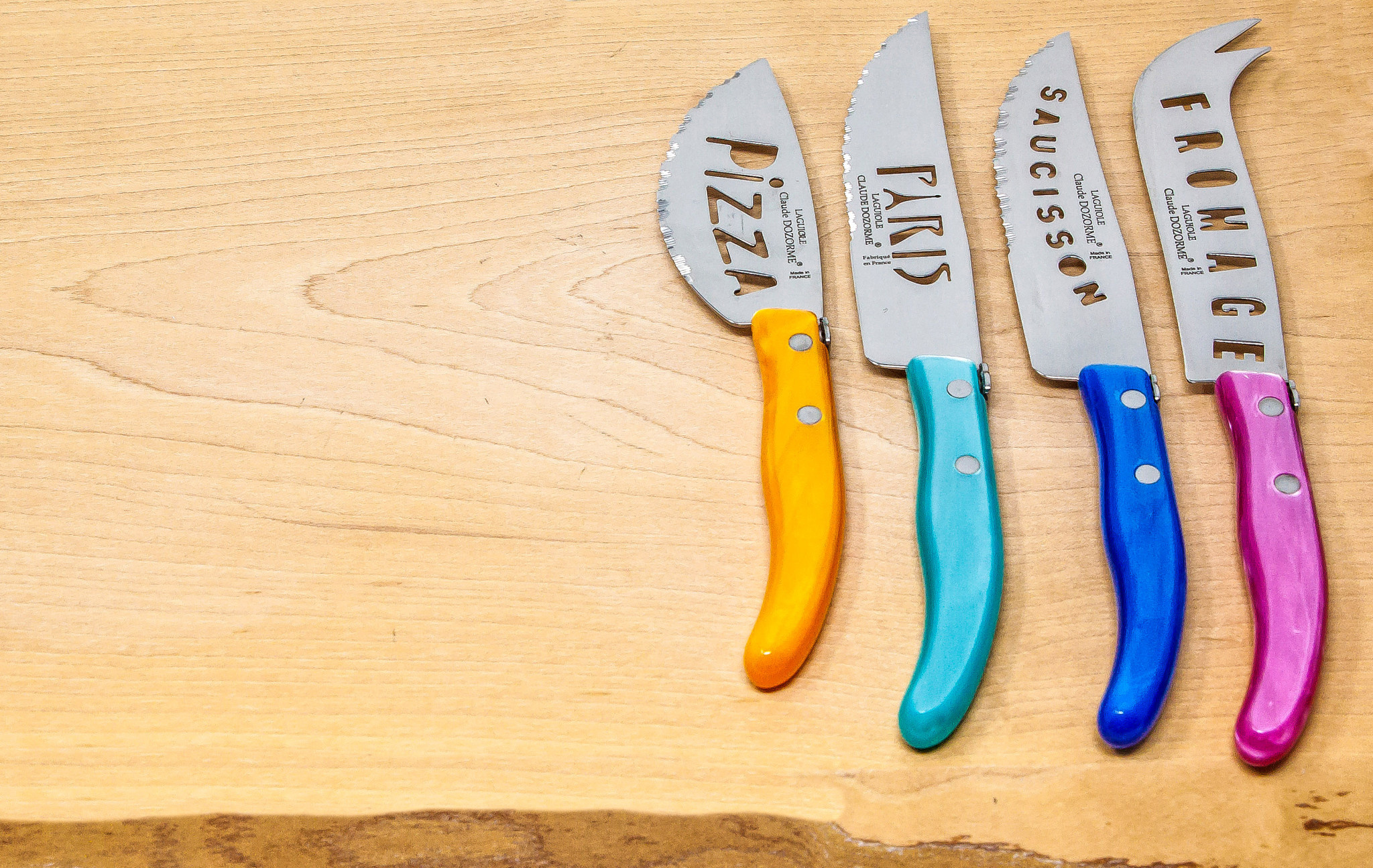 Claude Dozorme uses high quality stainless steel X50CV13, with a methacrylate handle. All accessories are dishwasher safe. The color is directly cast in the resin and will not lose their luster after washing!