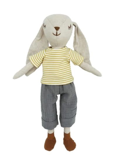 Baxter bunny doll instantly hops into hearts. Smartly dressed in a yellow striped shirt and denim shorts, our dapper bunny soft doll is ultra-plush for hours of snuggling.