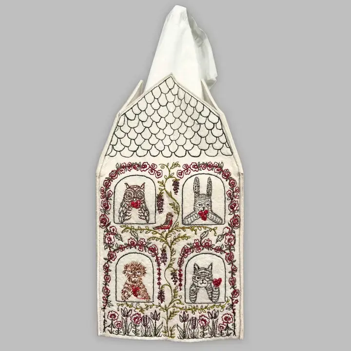 A tissue box cover embroidered on all sides with different welcoming animal friends holding hearts!