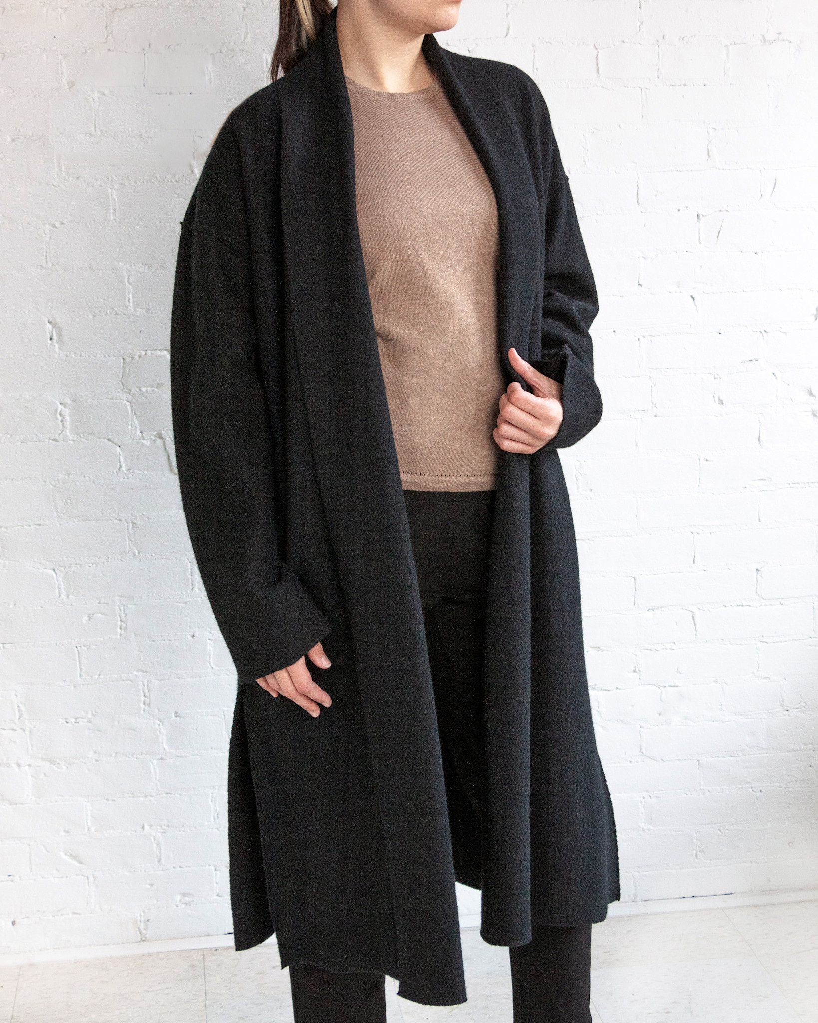 Create an account- High collar, drop shoulder, open front.