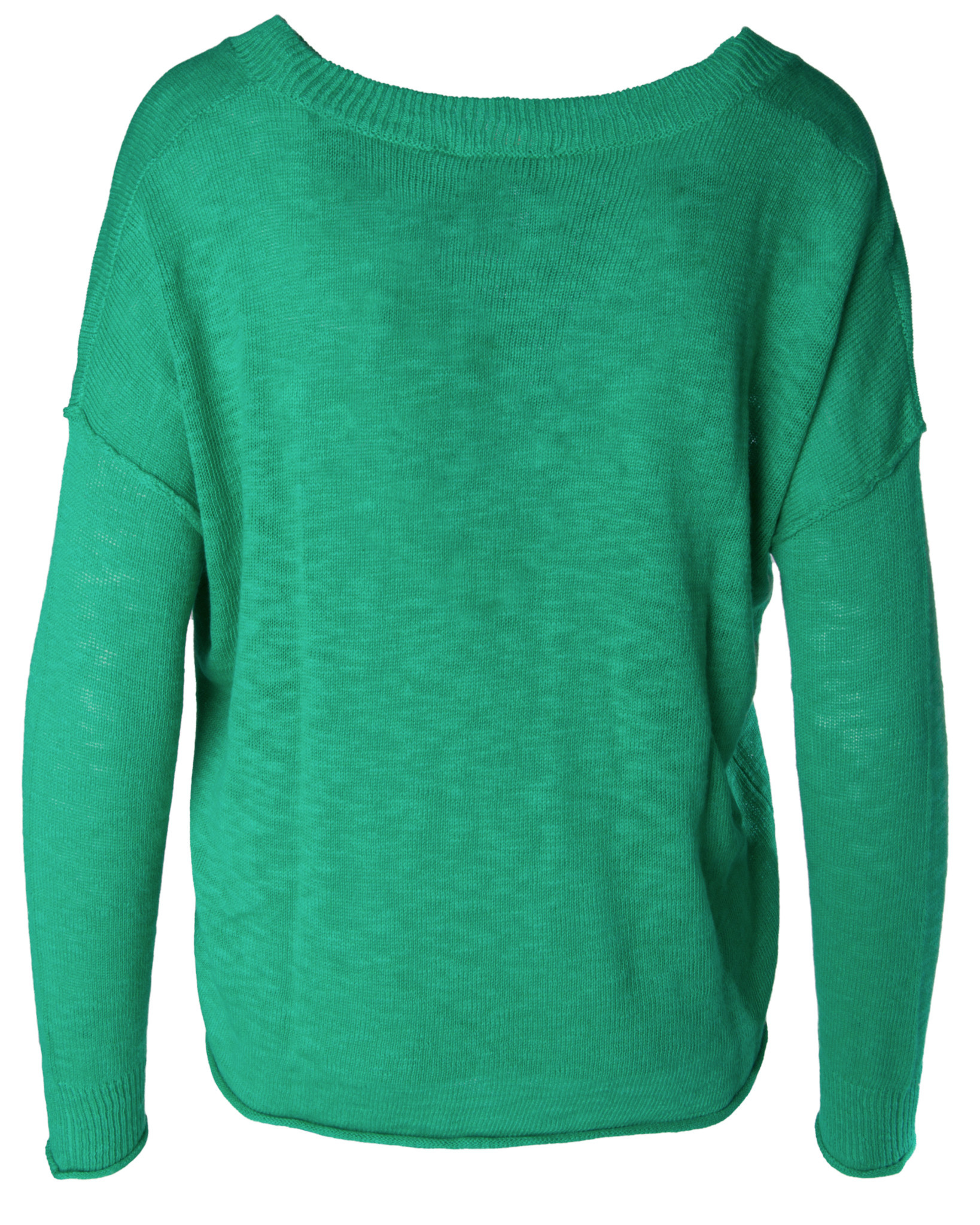 60% cotton and 40% viscose, green, slub v-neck sweater.
