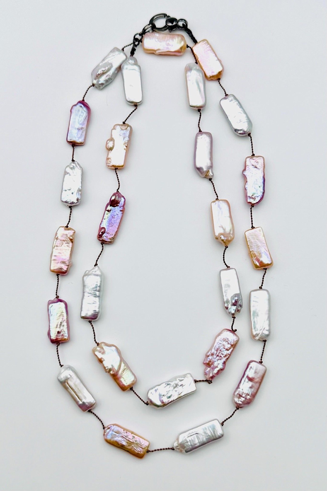 - Pink, purple, and white rectangular biwa freshwater pearls