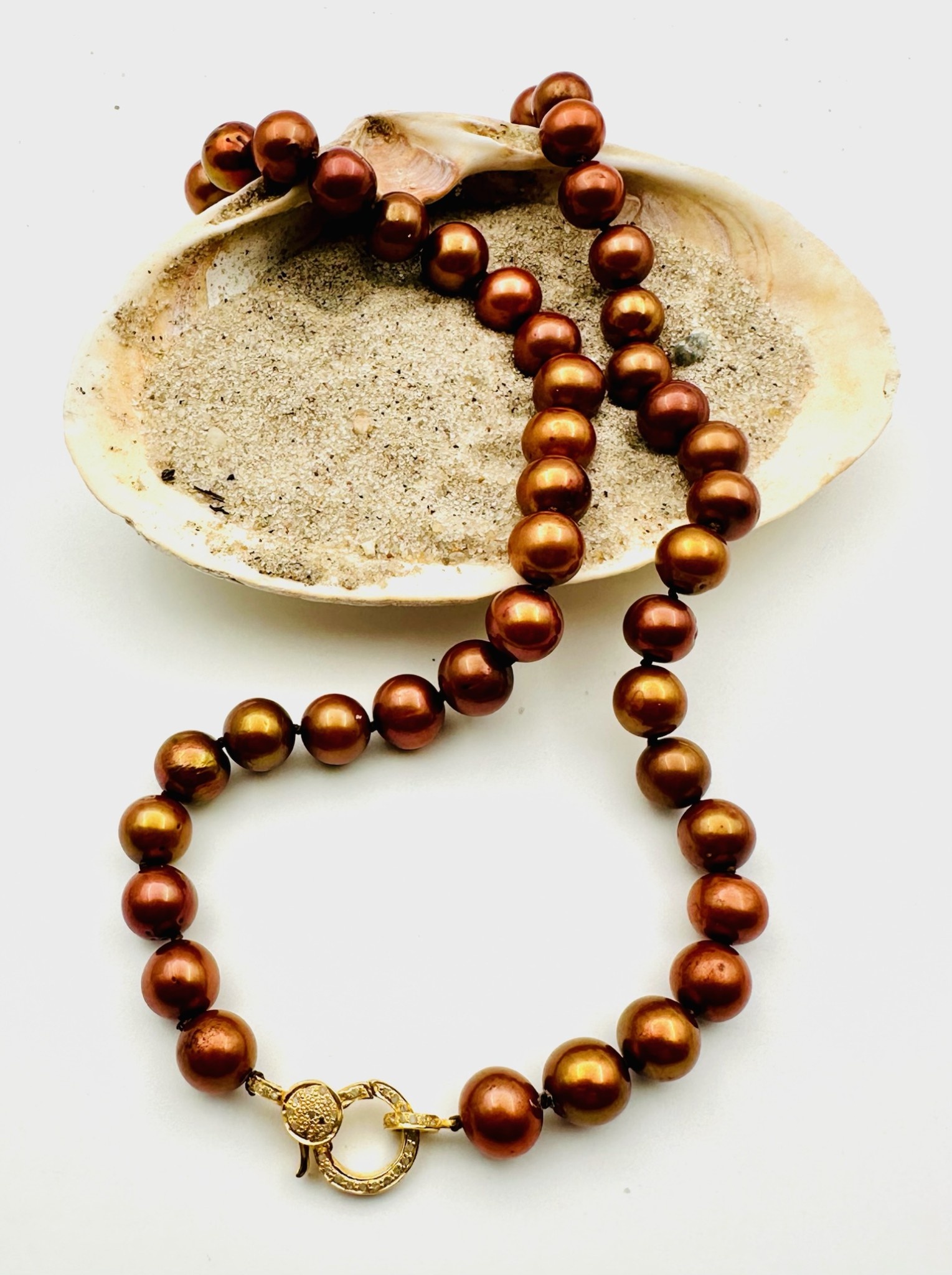 9mm bronze colored freshwater pearl necklace with 18k gold vermeil and sterling silver clasp with diamonds.