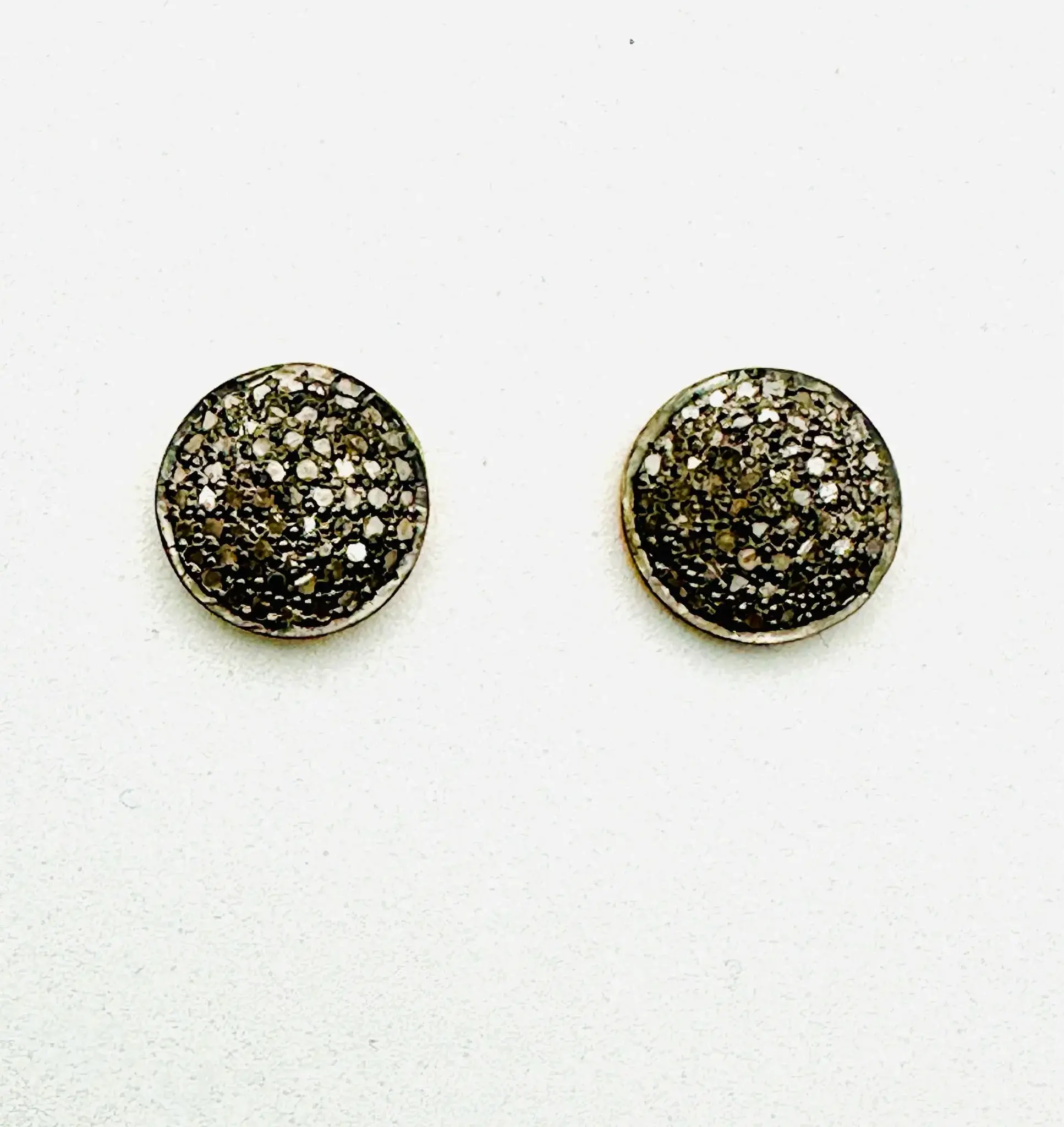 Circular rhodium and 14k gold vermeil pave diamond stud earrings.