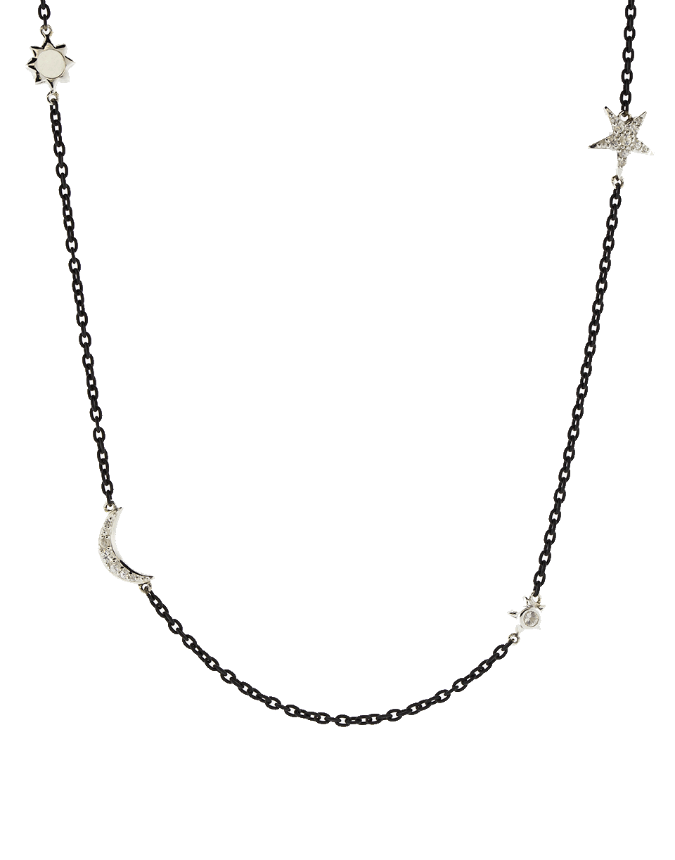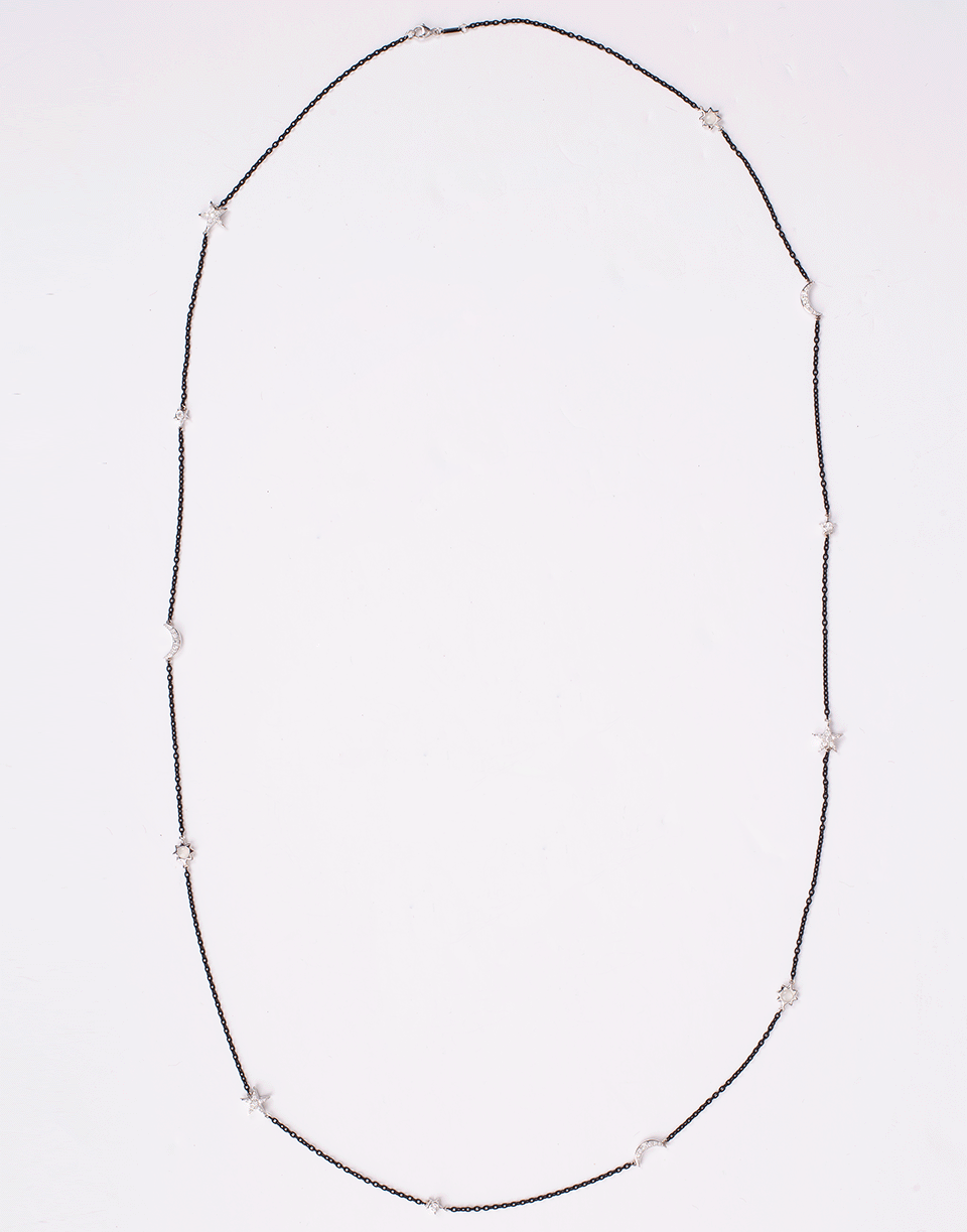 Strands of suns, moons and stars on chains with moonstones and white sapphires to combine with your favorite necklaces. Layer on to add to your neck story.