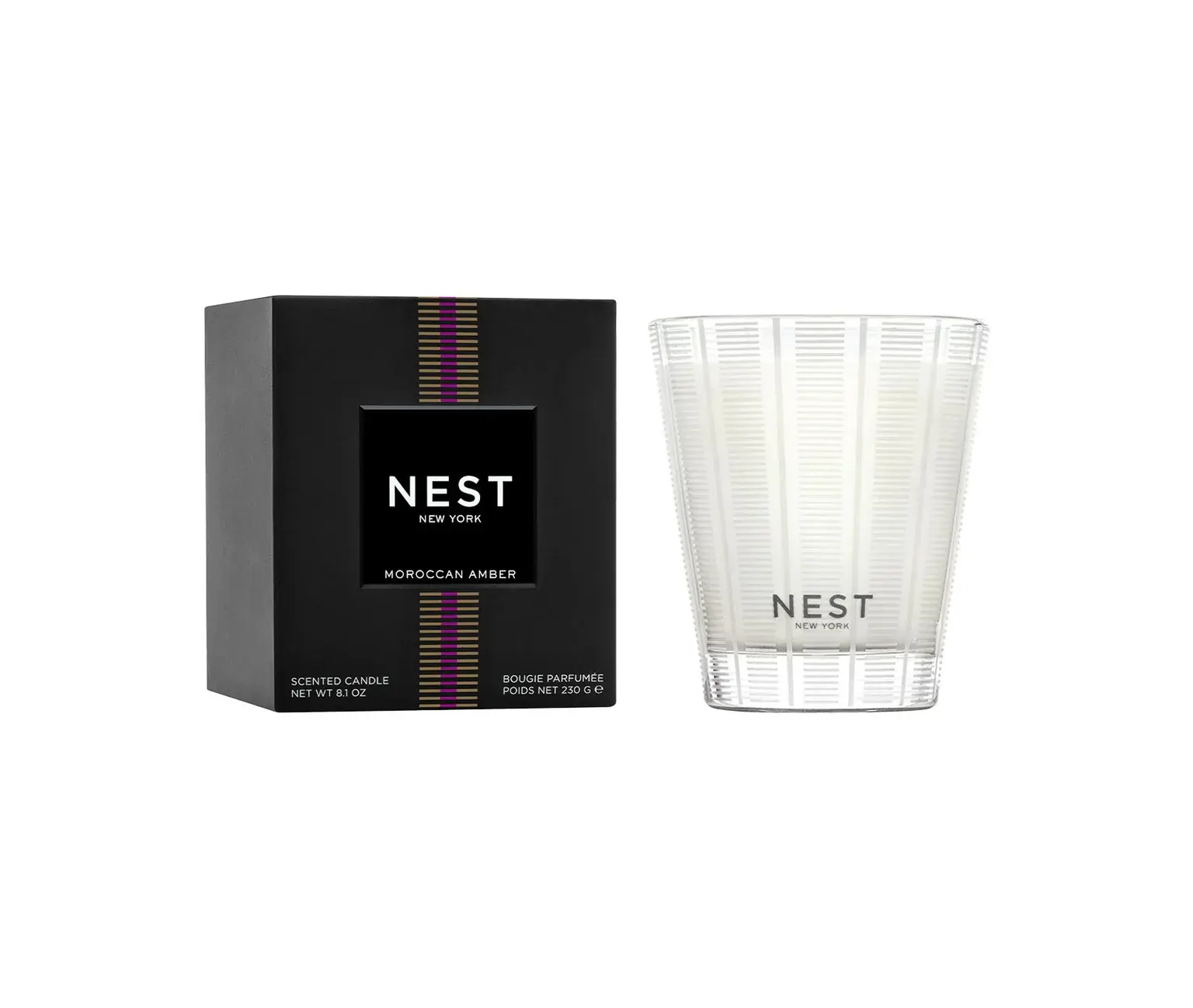Housed in a glass vessel etched with elegant, frosted stripes to complement any decor.