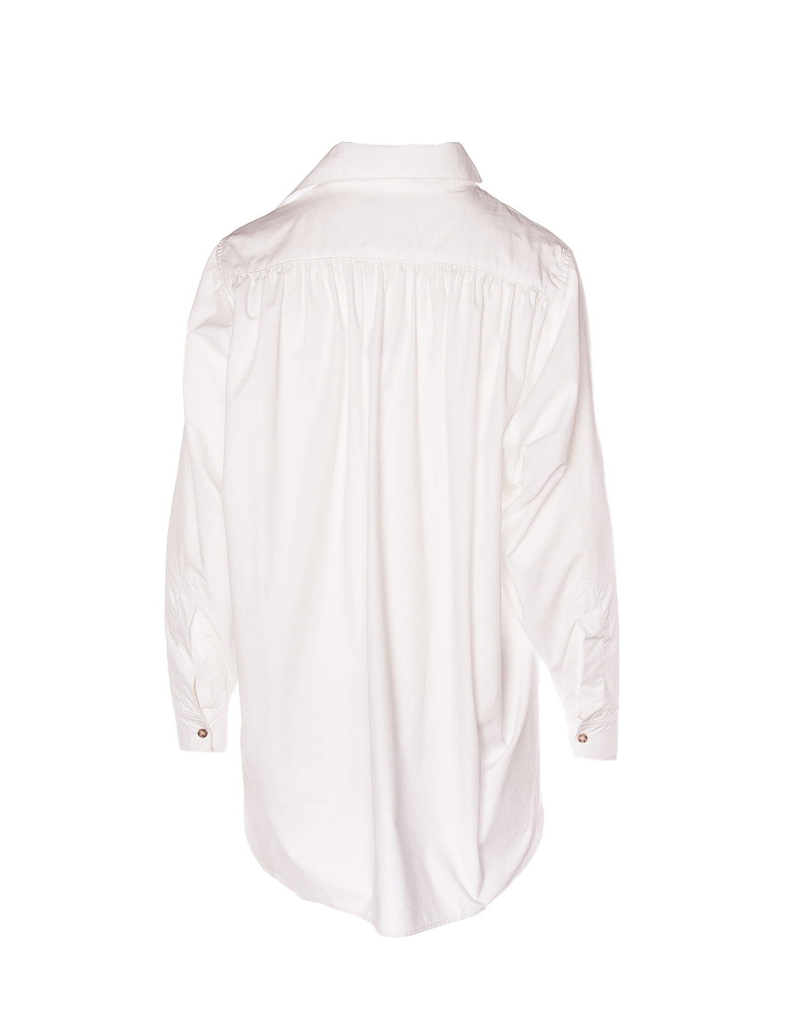 Create an accountWe LOVE a great white shirt! This oversized relaxed cotton button down with brown tortoise buttons, full length button sleeves, and pleating in the back for some extra flow is one of our favs!