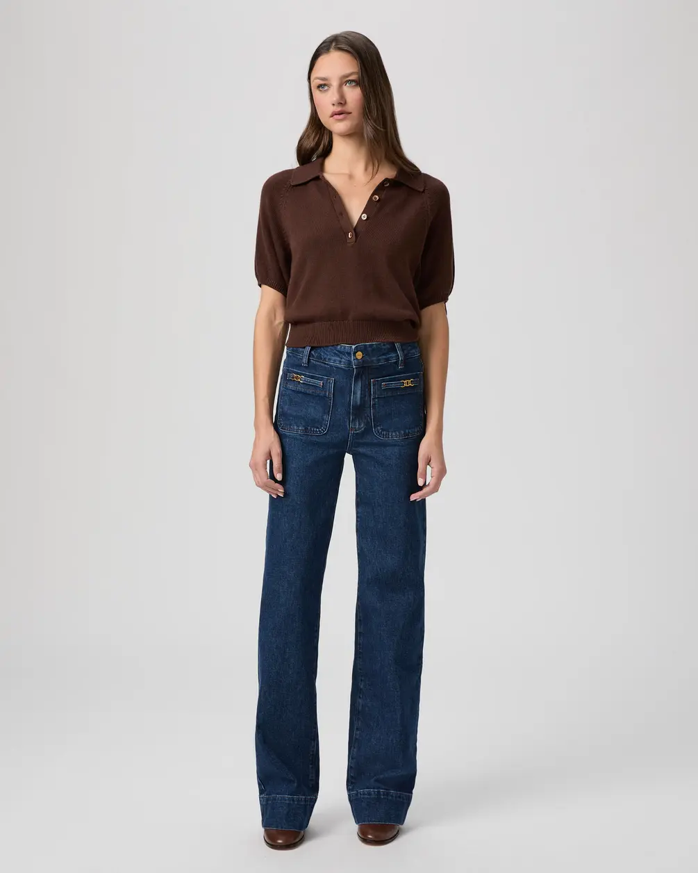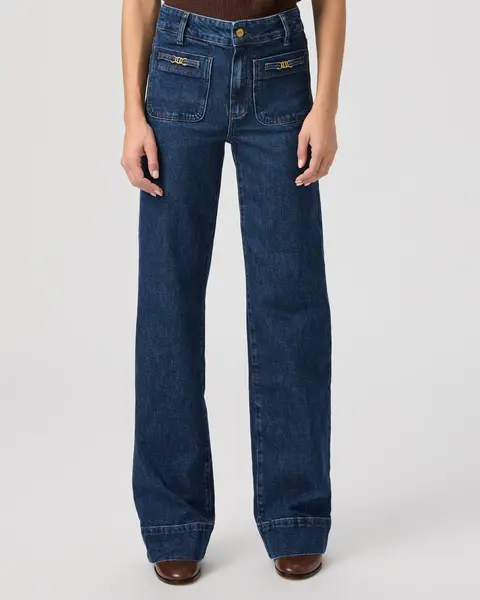- Dark wash, patch pockets, gold hardware