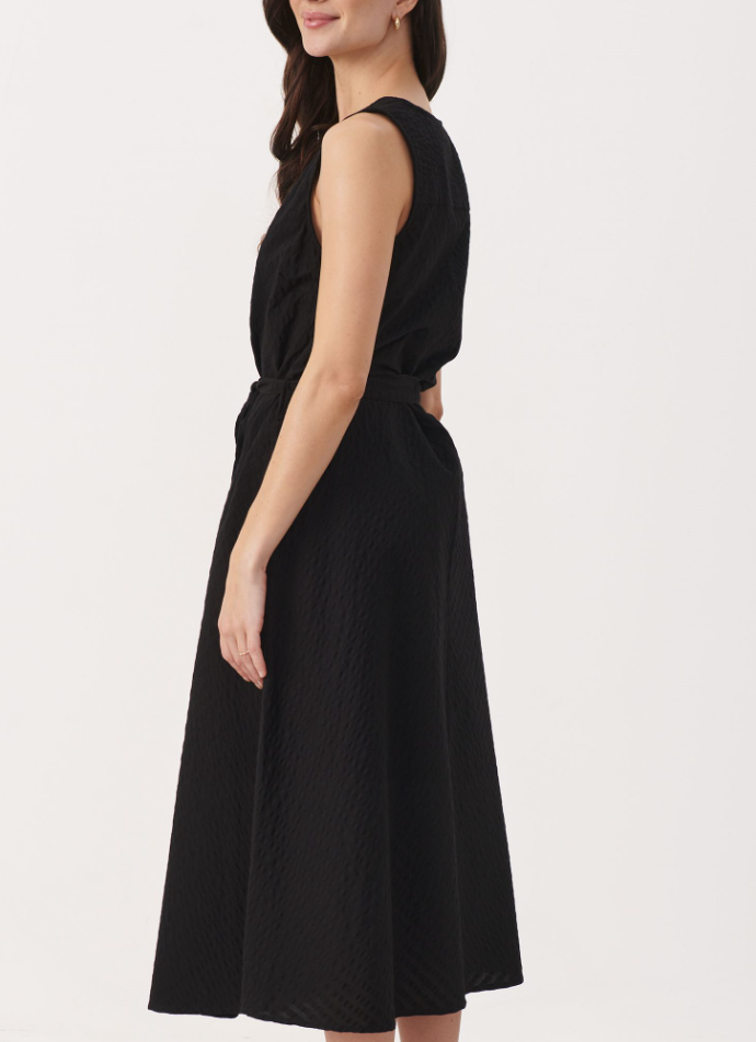 Create an account100% cotton sleeveless dress in a midi length. V-neck with a self-tie belt at the waist. Fabric has lightly puckered look.