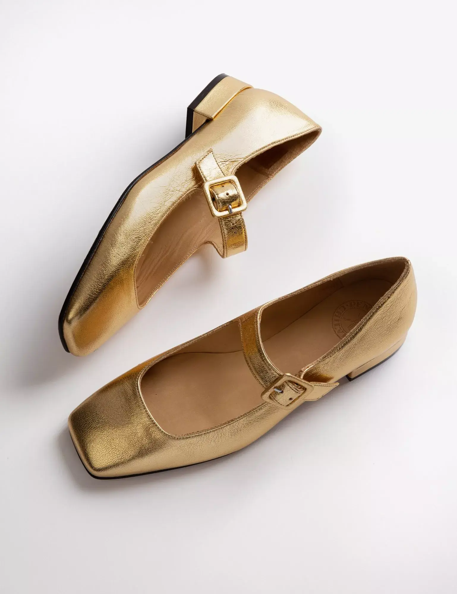 Create an account- Spanish metallic leather with covered buckle and heel.