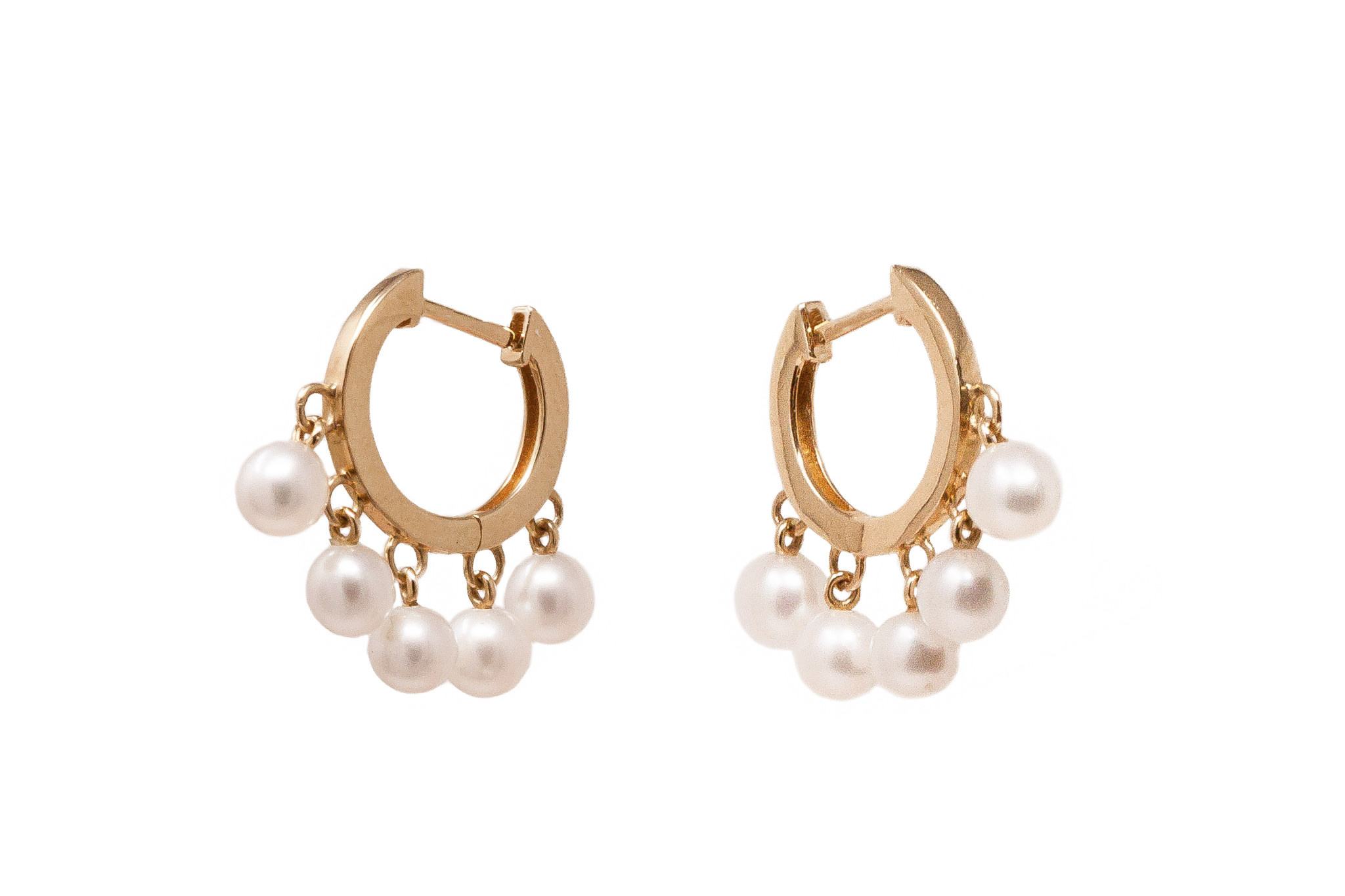 - 14k yellow-gold medium huggie hoops with drop pearls