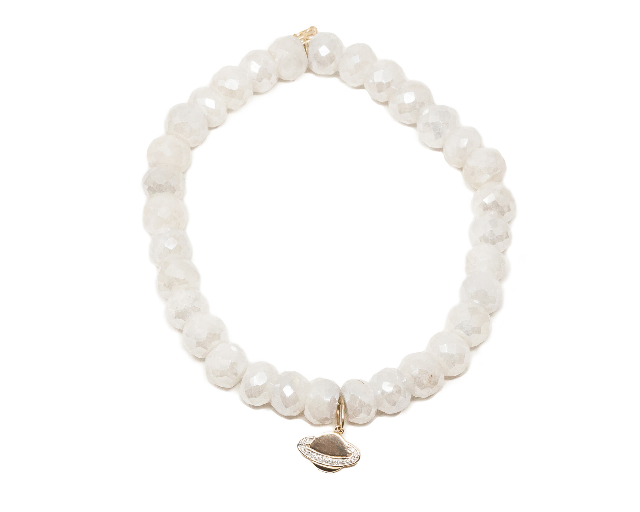 14k yellow gold, white diamond saturn on  faceted white quartz stretch bracelet.