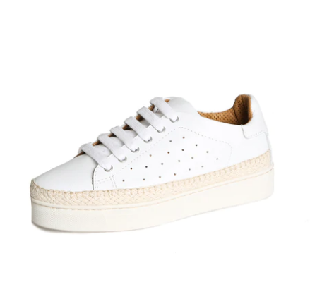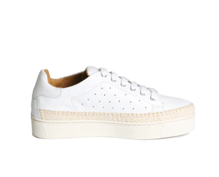 Create an accountA lace up sneaker with all the bells and whistles. Wrapped a high walled rubber sole and just a whisper of jute that is top stitched. Add a touch of perforation, a padded collar and finish with a lively metallic lace and matching heel.